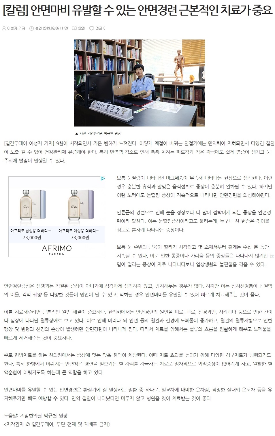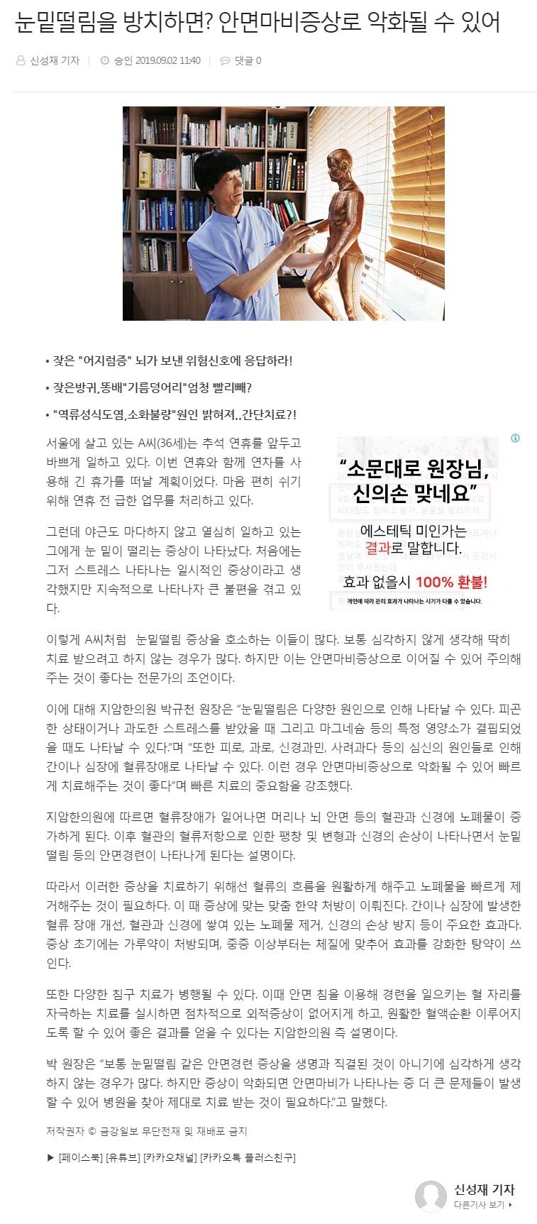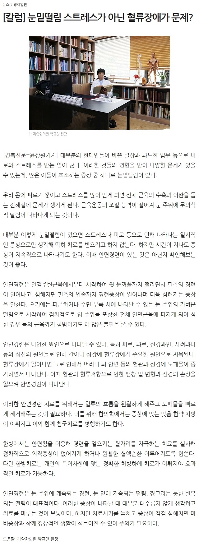 [경북신문][칼럼] 눈밑떨림 스트레스가 아닌 혈류장애가 문제?