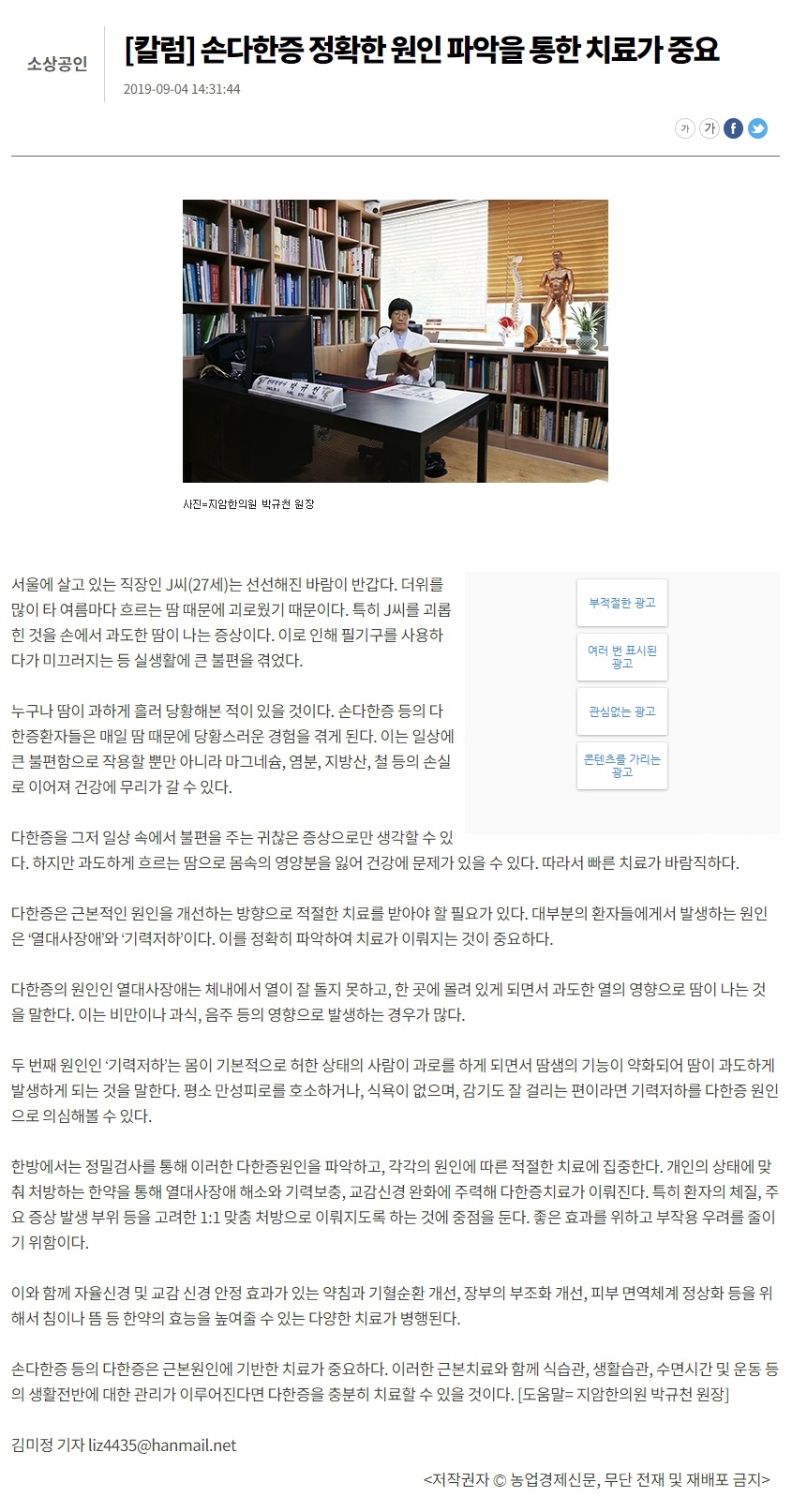 [농업경제신문][칼럼] 손다한증 정확한 원인 파악을 통한 치료가 중요
