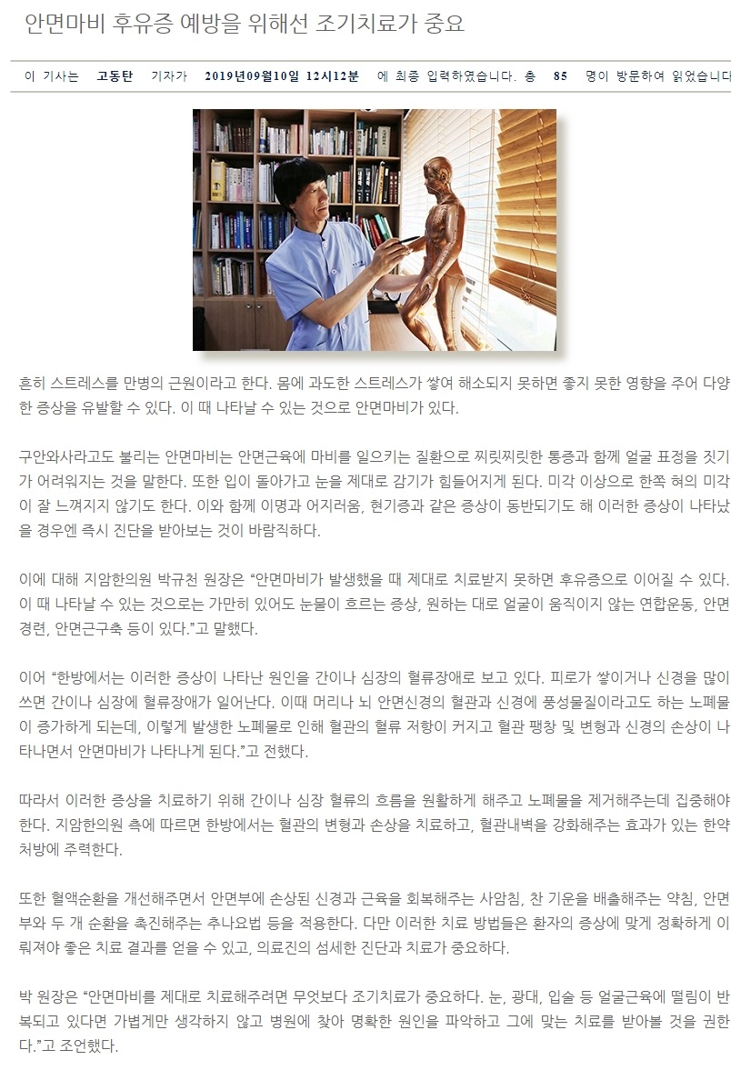 [일간투데이][칼럼] 안면마비 유발할 수 있는 안면경련 근본적인 치료가 중요