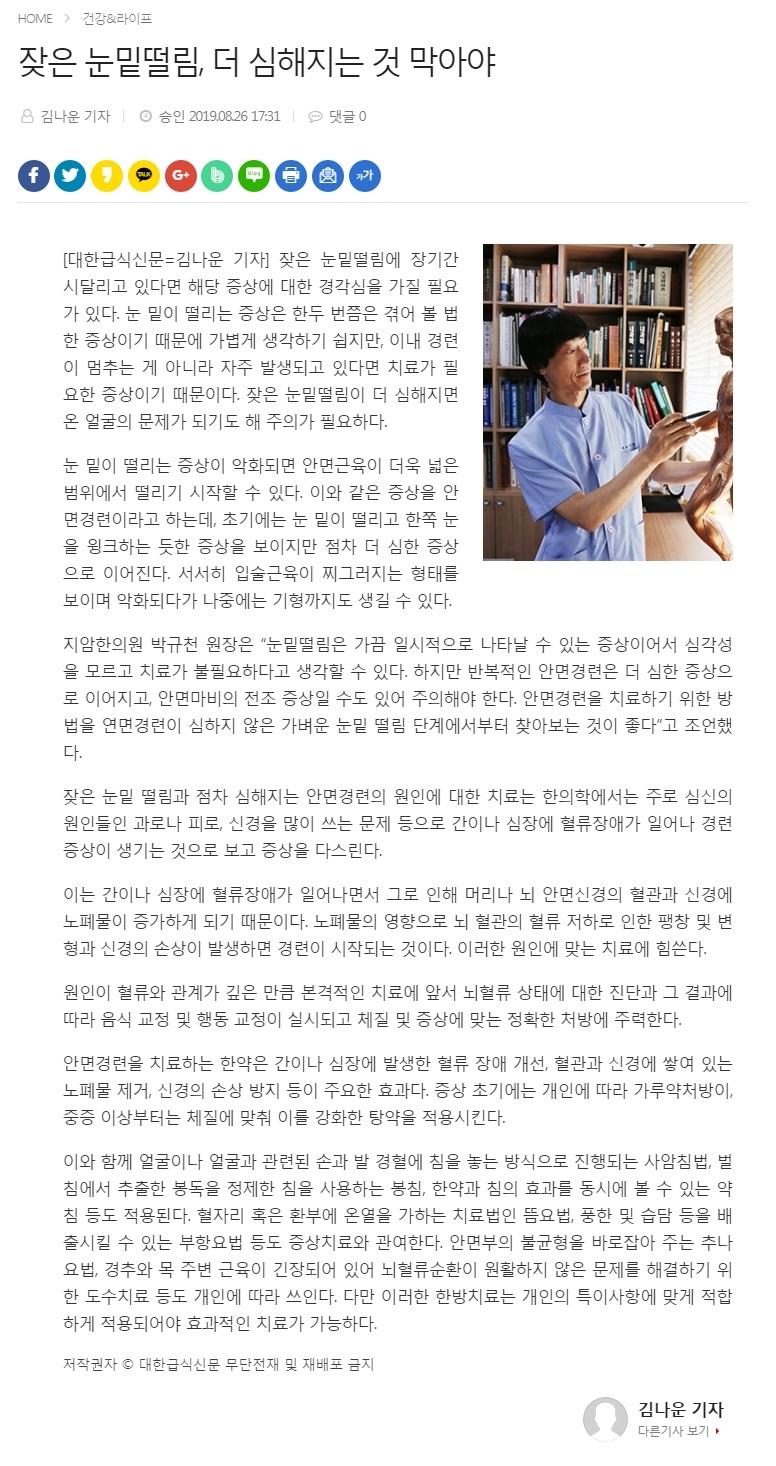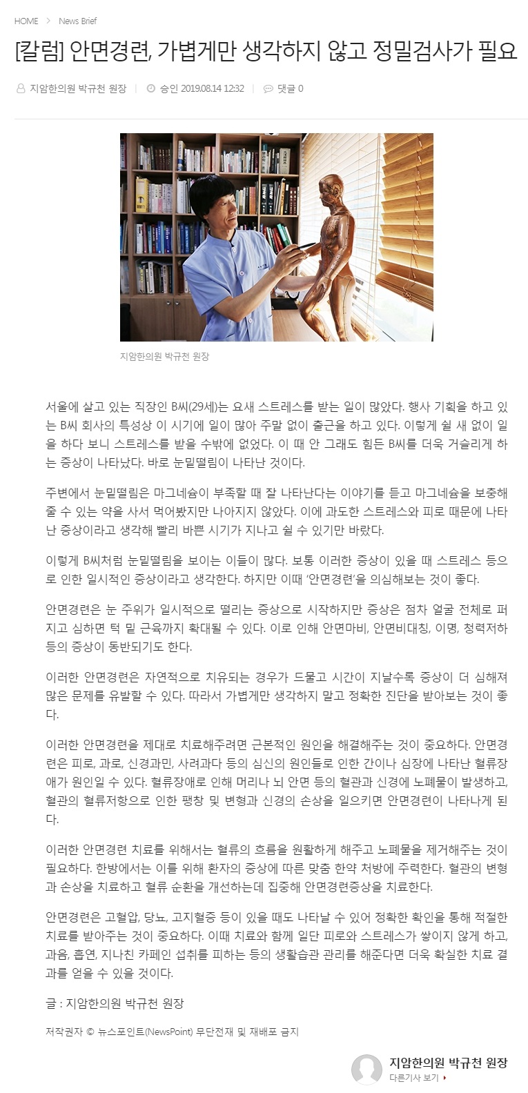 [뉴스포인트][칼럼] 안면경련, 가볍게만 생각하지 않고 정밀검사가 필요