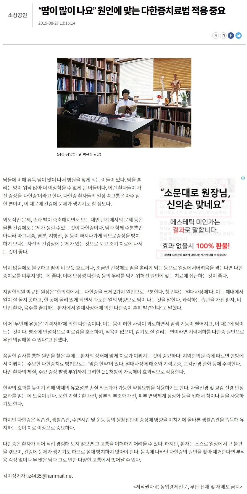 [농업경제신문]“땀이 많이 나요” 원인에 맞는 다한증치료법 적용 중요